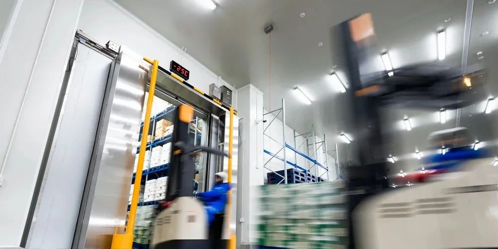 用冷風機降溫,溫度可達1℃~10℃,并設有滑開式冷藏門,軟性密封接頭,冷藏車可直接靠到月臺上,實行門對門的裝卸,作業,使進出庫基本不受外界溫度的影響。小型冷庫可在進門處建造門斗。 早期單扇速度為0.3~0.6m/s,目前高速電動冷藏門開啟速度達到了1m/s,雙扇冷藏門開啟速度達到2m/s。為避免危險,關閉速度控制在開啟速度的一半左右。門前裝有傳感式自動開關。這些裝置都是旨在縮短開關門時間,提高裝卸效率,減少操作人員停留時間。 采用發熱量小,功率小,亮度高的高效燈具,如鈉燈。高壓鈉燈效率是普通白熾燈的10倍,而能耗僅為低效燈具的1/10。目前在一些比較先進的冷庫中使用新型LED作為照明,發熱量和能耗更小。